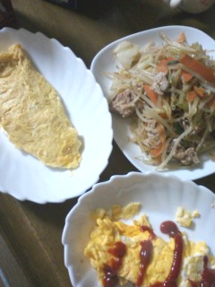 写真は、ケチャップが母作。普通の卵焼きがAちゃん作。