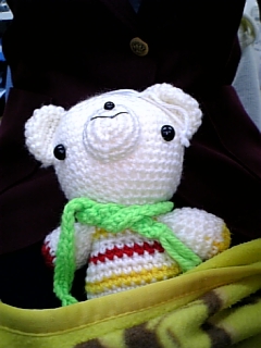 で、手編み人形を会社に持ってきたんですねぇ~♪ 今リアルで膝の上に居ます。